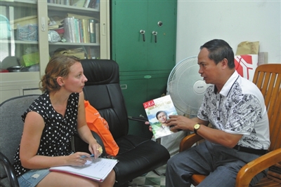 近日,澳大利亚麦考瑞大学博士生Alexandra Grey(惠艾丽)到广西三月三杂志社考察壮族语言文化。她主要就壮语、壮文的使用情况和壮文报刊的编辑、出版、发行等问题进行采访。Alexandra Grey(惠艾丽)从包里拿出一本《三月三》壮文版的杂志,高兴地说:“我在澳大利亚就听说过,有一本壮文版的《三月三》杂志,但是我没有机会见到它。这次,我到中国来,在云南省得到一本,非常高兴。”