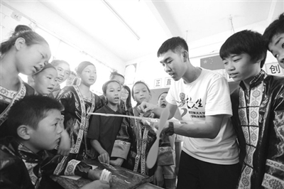 连日来,南京航空航天大学的学生组成支教团,来到龙胜各族自治县乐江乡西腰小学,为当地的侗族留守儿童教授航模、快乐英语、趣味数学、音乐等课程,陪他们一起度过不一样的假期。图为7月10日,该小学的学生正在与支教成员组装飞机模型。(韦吉阳 秦文婕 摄)