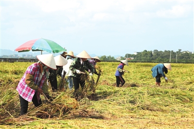 7月22日,宁明县寨安乡江逢村群众组成互助队正抓紧抢收被洪水浸泡的水稻。受强台风“威马逊”影响,宁明县农作物受灾面积660457亩。22日洪水开始缓慢消退后,全县13个乡(镇)、3个农场迅速组织指导群众抢收被洪水浸泡的农作物,尽量将损失降到最低限度。(周贻刚 黄浩能 摄)