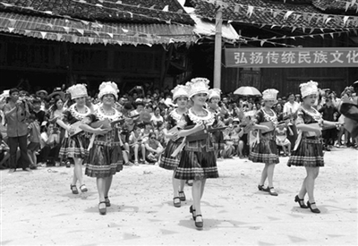 7月20日(农历六月廿四),龙胜各族自治县乐江乡地灵侗寨举办一年一度的“百家宴”民俗系列活动。这天,又称“关公节”。每年这天,当地数千名热情好客的侗族同胞都会邀请周边侗寨群众,聚在一起唱侗歌、吹芦笙、跳团圆舞,并拿出自家精心制作的侗家三宝(酸肉、酸鸭、酸鱼)等特色佳肴和糯米酒聚集到村头的风雨桥前共进百家长桌盛宴,共话团结幸福的美好生活。图为地灵侗寨的姑娘载歌载舞,欢庆幸福生活。