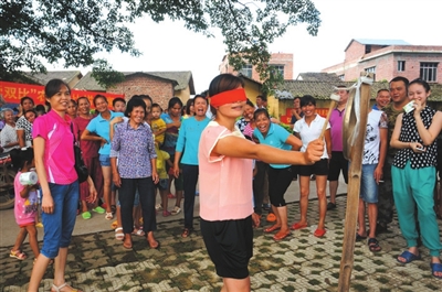 如果说抛圈套鸭子刺激神经,那么“盲人敲锣”、亲子活动更让人捧腹大笑。敲锣的人在五米开外蒙上眼睛,然后在原地转上两圈,再走到对面敲响绑在扁担上的一面锣。这看似容易,但是不少群众在原地转了两圈之后,就变得一脚高一脚低的,像个醉汉一样,找不着方向,更不知道锣在哪里咯,左敲右敲不中后,拉开蒙眼的布,发现锣竟然就在眼前。