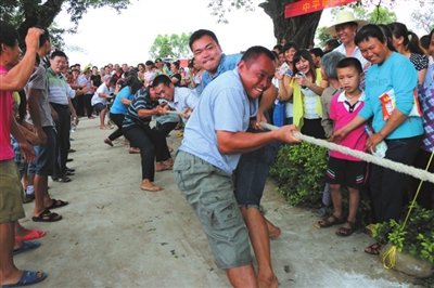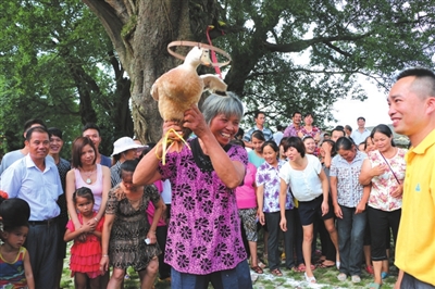 一大早,整个村子人声鼎沸,村头的大榕树下洋溢着欢乐的气氛,到处充满了欢声笑语,好不热闹。抛圈套土鸭拉开了当天趣味活动的序幕。“不好意思,我套中了,鸭子是我的啦,哈哈哈……”一位村民套中鸭子之后,高兴得在那里手舞足蹈。“这么容易抛,什么时候到我们呀……”排在后面的群众迫不及待地往前挤,生怕鸭子都被别人套走了。