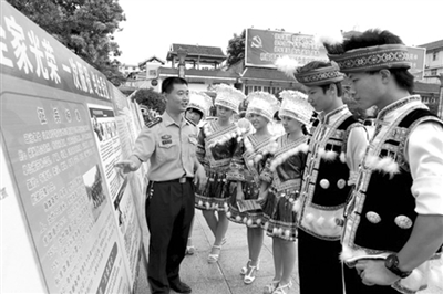 今年征兵工作开展以来,融水苗族自治县组织征兵工作人员走村串寨,深入街道、小区、学校进行征兵宣传,通过山歌、短信、微博等形式向应征青年宣讲征兵政策。截至目前,全县报名应征人数已达400多人。图为7月26日,该县人民武装部工作人员向当地苗族青年讲解征兵政策。(韦鼎标 摄)