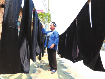 三伏天气,骄阳似火,是侗族妇女制作侗布的绝佳季节,在三江侗族自治县侗寨,随处可见侗族妇女晾晒自纺自染的侗布。侗布是侗族人家用自家织好的棉布经蓝靛、白酒、牛皮胶等混合成的染液反复浸染、蒸晒、槌打而成。由于其制作工艺复杂,侗布非常珍贵,侗族人民除了自己用外,还作为婚嫁馈赠的最佳礼品。染制侗布亦成为侗族文化的千年瑰宝和侗族妇女的夏日“必修课”。图为 8月3日,在三江侗族自治县良口乡产口侗寨,一位侗族妇女在晒侗布。