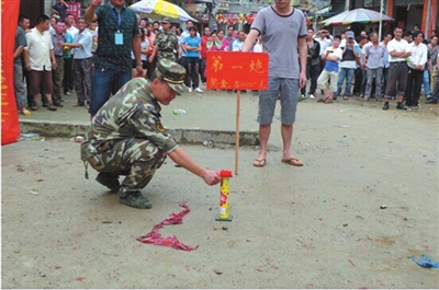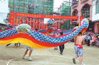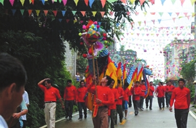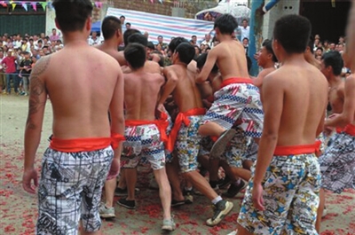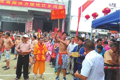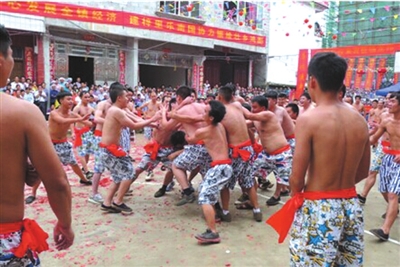 最激烈的活动当数抢花炮了,里三层外三层的观众,把场地围了个水泄不通。只见参加抢花炮的80位小伙子,站在抢花炮场地中央,个个虎背熊腰、虎虎生威,都想着要抢到花炮,祈求给自己及家人带来好运。抢的人紧张,看的人更加激动。只听“轰轰轰”三声花炮响声,圆球彩珠冲上云霄,似彩蝶飞舞,如仙女散花徐徐降落。人群欢声雷动,看那小伙们如猛虎下山,穿插来往于人流中向着圆球彩珠降落的方向奔去。只见他们身影忽上忽下,忽左忽右变幻莫测。后生仔憋足了劲,姑娘们笑得前仰后倾,老汉似喝醉酒,小儿乐得手舞足蹈。观众的喝彩声、欢呼声犹如汹涌的浪潮,把热闹的气氛步步推向高潮。当小伙中的一位抢到了圆球彩珠跑到主席台关公塑像前拜神灵,裁判员立马吹哨判定获胜名单,此时全场鞭炮齐鸣,鼓乐震天。获胜者上台领奖后,由参赛队员按获奖等次抬着一、二、三炮镜匾拥戴着获胜者到家中,祈求福气财运自今日起降临到获奖者身上。