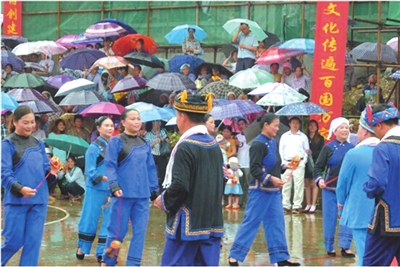 那边,抛绣球活动场上,人山人海,传来阵阵欢笑声,那是人们在参加抛绣球活动。龙邦的抛绣球活动源远流长,文化底蕴深厚,它的产生演变至今已有800多年的历史,据《靖西县志》记载,绣球原为靖西龙邦一带乡村男女青年成群结对唱山歌,谈情说爱随手摘下山间花草,用藤扎成花球,抛给意中人的一种信物。而后演变成绣有莲花、鸳鸯等吉祥物的绸巾,包上重物连上丝绳,最后发展成为现在的形状。绣球穿梭,盛情交流,如今抛绣球已经从古时的男女传情达意,演变成如今的文化活动。