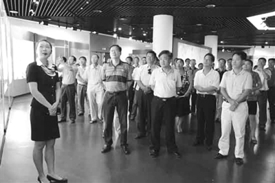 图为26日下午两委第二批参观的干部在展厅内观看展览。