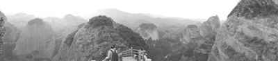 爬八角寨,登云台山,远眺云海群峰。自湖南新宁县崀山镇的石级稍缓,级数亦不多;从梅溪步入则不同,台阶掩藏于竹木深处,皆搭建在陡峭的岩石边上,登高转弯,然后再转弯登高,沿途有几处凉亭,供老人小孩等体力不支者歇脚休整。也有猎奇心极强,寻求刺激的游客从崀山镇骑马登高,精瘦结实的马匹沉着有力,其“笃笃”声响,一路洒落;在临崖或转弯处,马主人用竹木做成栅栏,游客皆觉有惊无险。
