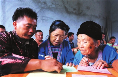 图为9月3日,在融安县长安镇安宁村大袍屯,几名苗族群众在填写选票。