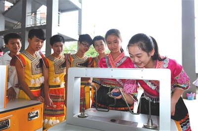 图为9月9日,在龙胜各族自治县的流动科技馆里,实验中学的瑶族学生们在体验科技的魅力。(通讯员 韦吉阳 摄)