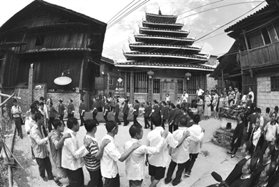 9月13日,三江侗族自治县林溪乡高秀村举办北门鼓楼落成庆典,数千名湘桂群众以传统风俗、百家宴、月也等富有民族特色的活动欢庆该村第7座鼓楼诞生。鼓楼是侗寨标志性建筑,与侗族大歌、风雨桥合称“侗族三宝”。目前该县鼓楼数量已超200座,被誉为“世界桥楼之乡”。图为侗族群众跳多耶舞欢庆新楼落成。(龚普康 曹世英)