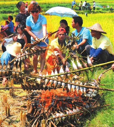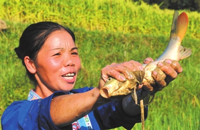 种稻养鱼快速发展。今年三江整合扶贫、发改、水利等各部门资金700多万元在全县实施种稻养鱼项目,并将良口、八江两个乡镇作为该项目实施整乡推进,全面完善农田水利设施建设;同时着力规划好良口乡晒江百亩禾花鲤种质繁殖保护区和良口、八江、洋溪、独峒等8个乡镇的7万亩稻鱼养殖区。通过科技普及、示范带动、点面结合,力争至2015年,形成集生产、加工、流通一条龙的“公司+基地+农户”的运作模式,全力打响高山稻鱼和高山鱼稻品牌,把三江打造成为珠三角、桂北地区重要的生态农产品供应基地。目前,当地示范养殖的农户每亩可以收获“高山稻鱼”40至50公斤,田边销售价格每公斤40元以上,亩产可为群众创收1800元左右,高山稻鱼成为群众增收致富的新兴产业。