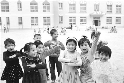 图木舒克古老而又年轻,位于南疆的阿克苏和喀什之间,是古丝绸之路上连接东西方文化的重镇。2002年,国务院批准设立新疆维吾尔自治区县级直辖市图木舒克市。这座新城市是新疆生产建设兵团第三师建设起来的,实行师市合一管理体制。图为五十团双语幼儿园,同班的维族孩子和汉族孩子一起边游戏,边跳着流行的《小苹果》。