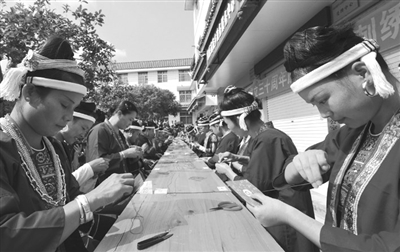 10月11日,三江侗族自治县同乐苗族乡在同乐街举办侗族刺绣手工绣技限时赛,来自该乡的50余名侗、苗“绣娘”身着民族盛装,向现场观众展示侗族刺绣的精湛技艺,热烈欢庆该乡成立30周年,促进侗族刺绣技艺代代相传。(龚普康)