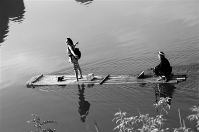 秦宇子乘坐竹排进村,竹排在波光潋滟的“鼎力”河中缓缓飘荡,河边有小孩游泳、戏水,村妇们洗衣、洗头,还有人在撒网打鱼。这时,岸上传来了乡亲们动听的山歌:“妹是壮家百灵鸟,游遍四海今归巢,亲人盼你早早归,美酒佳肴少不了……”看着家乡美丽的湖光山色,听到乡亲们悠扬的山歌,秦宇子情不自禁地向乡亲们挥手、欢呼。下了竹排,秦宇子被热情的乡亲们簇拥着回家,她跟乡亲们一样赤着脚,感受着家乡的热土。小孩子们拉着秦宇子的手,兴高采烈地嚷嚷着:“回家啰,回家啰!”
