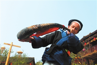 图为10月12日,在“歌娅思谷·中国白裤瑶民俗风情园”,一名白裤瑶男子在表演吹牛角。