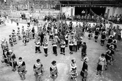 10月26日,融水苗族自治县香粉乡雨梅屯苗寨举行“打同年”联欢活动,四村八寨的苗族同胞欢聚一堂,以吹奏芦笙地筒、跳芦笙踩堂舞等方式共叙兄弟情谊,共话民族感情,促进民族团结。“打同年”是融水苗族村寨的一种民俗,即友好村寨之间的拜年联欢活动,通过村屯联欢,加深相互了解,促进民族团结,人们互称对方为“同年”。图为两屯 “同年”们在吹芦笙跳踩堂舞。(谭凯兴 摄)