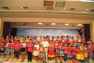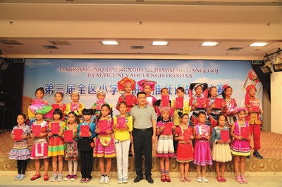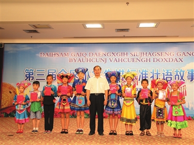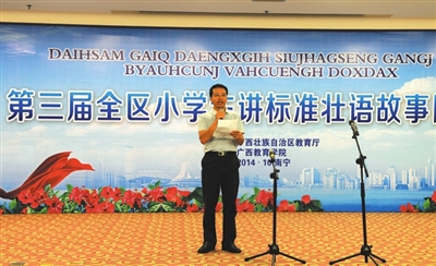 10月26日至27日,由自治区教育厅主办、广西教育学院协办的第三届全区小学生讲标准壮语故事比赛在南宁举行,来自全区壮汉双语小学的105名小学生参加了比赛。自治区教育厅副厅长白志繁出席开幕式并讲话,广西教育学院副院长王兴辉、自治区教育厅民族教育处处长韦兰明、广西教育学院成人教育学院院长周日南出席了开幕式。广西民族教育发展中心主任周克依主持了开幕式和闭幕式。