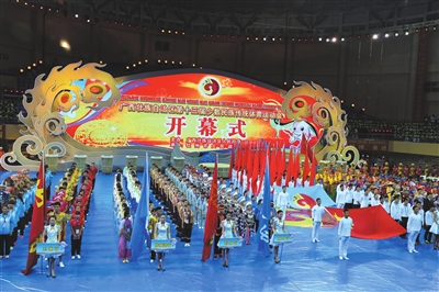 本报讯(记者 韦愿娜 文/图)10月28日晚,钦州市体育中心体育馆灯火通明,锣鼓喧天,红旗飞扬,由自治区人民政府主办,钦州市人民政府承办的广西壮族自治区第十三届少数民族传统体育运动会在这里隆重开幕。