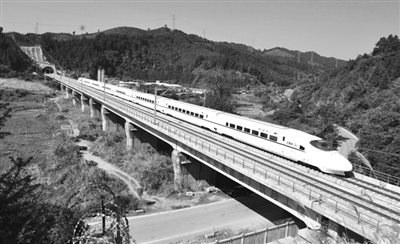 11月3日,一列广西桂林开往贵州从江的“和谐号”动车行经贵广高铁三江侗族自治县古宜镇马坪村古利大桥。近年,该县大力发展“两茶一竹”、高山稻鱼等特色农业,全力加快广西特色旅游名县创建步伐,着力将侗乡打造成为珠三角、桂北地区重要生态农产品供应基地和桂湘黔民族旅游集散地,翘首喜迎侗乡“高铁时代”的到来。