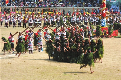 在开幕式及大型广场舞现场,除了传统的芦笙祭祀及芦笙迎宾曲、进村曲、芦笙踩堂“芦笙三部曲”外,首次亮相“芒蒿”庆丰收等盛大场景表演成为最大看点之一。开幕式表演中,上百名身披芒草,头戴面具的“芒蒿”,通过表演和与观众互动,祈福好运与吉祥。