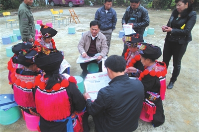 为了宣传贯彻党的十八届四中全会精神,11月18日,田林县民族局到该局所联系的八渡瑶族乡那拉村,通过召开座谈会、群众会等形式,用瑶话向村民宣讲、解读十八届四中全会精神,让深山里的瑶族群众明白四中全会精神,更好地掌握党的方针政策,更好地促进生产发展。图为该县民族局干部正在用瑶话向瑶族群众解读四中全会精神。