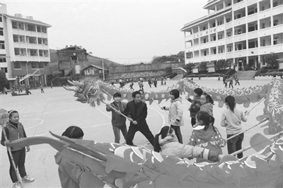 11月17日,龙胜各族自治县龙胜镇小学的学生正在学习舞龙的技艺。近年来,该县不断挖掘民族传统体育项目,将舞龙、舞狮、打陀螺、踢毽子等群众喜闻乐见的项目引进各中小学校课堂,并邀请当地的民间艺人传授各方面的技艺,使学生们在锻炼身体的同时,民族文化也得到了进一步传承。(韦吉阳/摄)