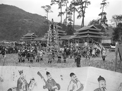 12月7日,上万名瑶族同胞聚集在恭城瑶族自治县观音乡水滨村石坪屯,一起祭祀他们的祖先盘王。当日盘王节文化活动精彩纷呈,有梅山图展示、吹笙挞鼓、瑶族绝技展示、原始狩猎斗兽、狂野抢河鱼等活动。图为盘王节主会场。(郑智敏 摄)