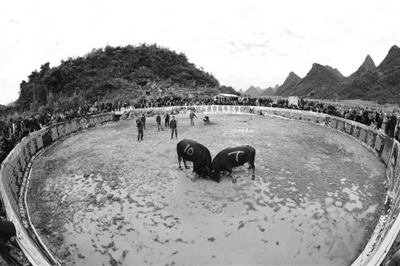 12月5日,融安县在大良镇新寨村举行首届“牛王争霸”大赛,庆祝晚稻喜获丰收,同时祈求来年风调雨顺,五谷丰登。