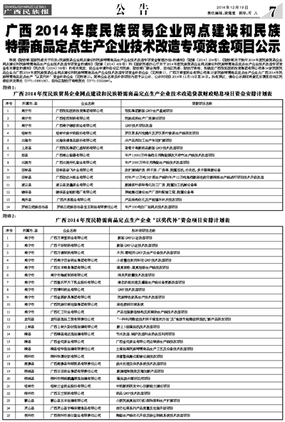 广西2014年度民族贸易企业网点建设和民族 特需商品定点生产企业技术改造专项资金项目公示