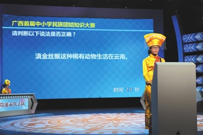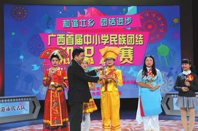 12月23日上午,广西电视台演播厅内座无虚席,一场以“和谐壮乡·团结进步”为主题的广西首届中小学民族团结知识大赛在这里举行。自治区教育厅副厅长黄雄彪,自治区民委副主任黄济健到大赛现场观看比赛。