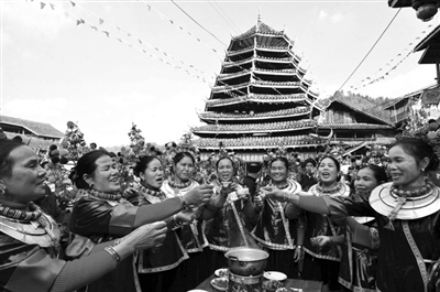 2014年12月28日,三江非凡国旅和广州东方国旅联合发起“返寻味之旅”,贵广高铁首发团150余名广东美食家深入三江侗族自治县林溪乡冠洞村冠大屯体验侗族百家宴,醉享侗族独特民俗及美食文化。这趟高铁美食之旅全力推动粤桂旅游市场实现资源共享、线路互推、客源互送。图为百家宴上,侗族妇女喜唱敬酒歌。