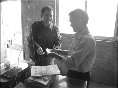 座谈中,那劳农民文学社社长黄志伟向3家媒体记者介绍了文学社成员的创作情况,目前他正在着手整理文学社各个成员交给他的小说、散文、诗歌等稿件,下一步打算出版一本文学社员作品集子。听了黄志伟的介绍,3家媒体记者都被他们热衷于文学创作的精神所感动,陈黎明还给文学社带来了广西容县籍作家、中国作家协会会员潘大林作品集《大林作品》的第一卷散文随笔集《梦中家园》,第二卷文化地理集《粤西之东》以及第三卷小说选集等具有独特的文学和人文价值的书籍;阮启枝得知那劳文学社由于经费欠缺,目前仅印了3期《金色田园》社刊时,当场个人捐款300元给文学社作为第四期《金色田园》印刊经费。