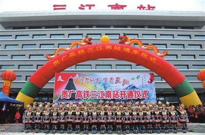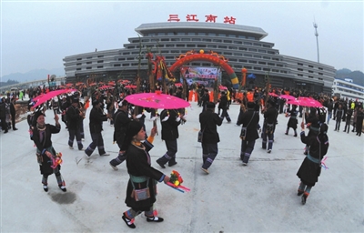 2014年12月26日9时20分,D2801次动车从贵阳北首趟开往广州南驶进三江南站,三江侗族自治县由此成为全国首个开通高铁的侗族自治县。“高铁时代”的到来,百里侗乡正乘势腾飞!