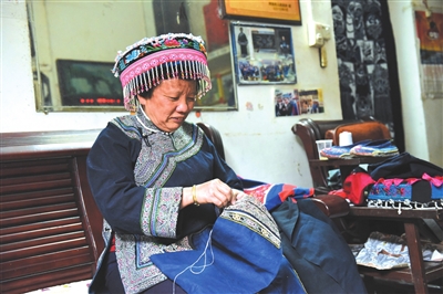 广西非物质文化遗产(仫佬族刺绣)传承人、罗城仫佬族自治县四把镇双寨村中寨屯年过五旬的谢秀荣坚持带徒弟,传授技艺,让仫佬族非遗文化得以传承,被当地人称为“绣娘”。目前,谢秀荣带领她的徒弟以及村上闲置的妇女劳动力为客商制作刺绣工艺品,每年可为全屯增加80万元的收入。