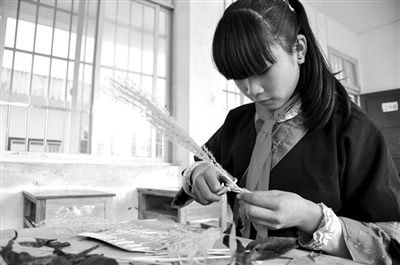 三江侗族自治县老堡乡白文村地处桂北深山,交通闭塞、贫穷落后,但这里侗娃们心灵手巧,心中燃烧着强烈的“七色梦”。因纸笔、颜料等相对昂贵,深山中各式植物色素丰富,侗娃们便就地取材,以树叶、芦苇秆、鹅卵石等为原料,以身边的侗族生态风光、人文习俗等为题材,以独特的艺术表现形式,精心创作出众多原生态的创意植物剪贴画,并于日前斩获国际绘画大奖。图为一名侗族女孩在裁剪芦苇花。