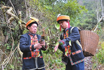 图为2月3日,民间瑶医赵文有带儿子赵良到深山采药,现场传授技能。