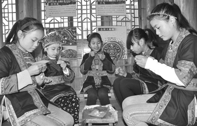 近年,三江侗族自治县着力加大侗族非物质文化遗产项目的挖掘与传承力度,通过实施民族文化进校园、进社区、进村屯以及多姿多彩的“非遗”技艺培训与竞赛等方式,将侗族大歌、侗族刺绣、侗族农民画及侗族器乐等项目引入中小学课堂,使侗族文化精品得以有效传承和发展。图为2月2日,几名侗族学子利用寒假时间在该县同乐乡同乐村平溪屯侗族刺绣传承基地内学习刺绣技艺。
