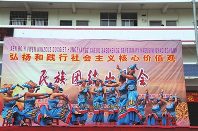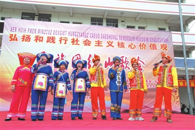 山歌会首先出场的是快板演唱社会主义核心价值观山歌《友善》,黄箭娟等五位表演者用武鸣壮语演唱得生动有趣、幽默诙谐,博得观众阵阵笑声和掌声。随后苏香莲等人表演了男女对唱社会主义核心价值观山歌《富强、民主、和谐、自由、平等》,农兰花等人表演了男女对唱社会主义核心价值观山歌《公正、法治、爱国、敬业、诚信》,山歌王梁秀荣献唱社会主义核心价值观山歌《文明》,这些本地的山歌手用当地群众最习惯的武鸣壮语,用壮族群众最喜爱的山歌这种形式传唱了党的十八大提出的24字社会主义核心价值观,形式生动活泼,内容来自生活,群众接受度和满意度高,宣传达到事半功倍的效果。在民族政策知识有奖问答环节,主持人刚刚提问:“民族团结进步创建活动的‘六进’具体指什么?”马上有观众积极举手回答:“进机关、进企业、进社区、进乡镇、进学校、进寺庙。”当工作人员把奖品派发到回答正确的观众手里时,还不忘用山歌表扬几句,结果得奖观众也不甘示弱用山歌回应答谢,台下你来我往的山歌对答一点也不输台上表演者的气势。