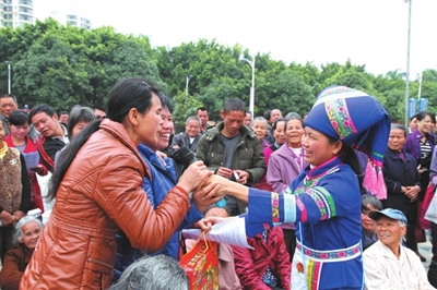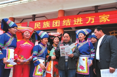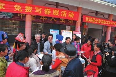 会场的另一边还同时进行免费为群众写春联活动,推动社会主义核心价值观和民族团结教育进村入户、入脑入心。山歌会结束后,全体工作人员现场发放社会主义核心价值观和民族知识宣传资料以及《三月三》杂志(壮文版),把中央民族工作会议精神传达到基层、宣传到群众,在全社会营造起贯彻落实会议精神的良好氛围。