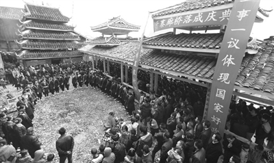 2月5日,三江侗族自治县独峒乡牙寨村举办新建廊桥落成庆典。当地上万名侗族同胞以多耶、芦笙踩堂、百家宴等多彩民俗形式喜庆廊桥落成,浓郁的“侗味”为羊年新春平添亮色。图为庆典现场。