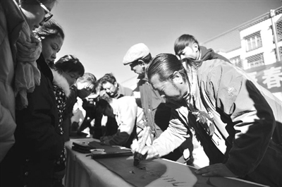 春节及藏历新年越来越近,年味也越来越浓,春联作为年味的载体之一,深受广大市民的喜爱。为营造春节及藏历新年节日气氛,西藏传媒移动媒体中心、西藏商报联合西藏自治区书法美术培训中心,于2月12日在西藏日报社大厅开展“羊年送祝福——藏汉双语春联现场送”活动。图为藏族书法家在为群众书写藏文春联。(来源:中国西藏新闻网)
