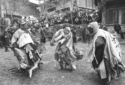 2月19日是农历大年初一,融水苗族自治县的苗寨、侗寨纷纷举行“猪灵”迎新、“帽告”拜年、吹笙踩堂等传统民俗活动,喜庆农历新年。图为融水苗族自治县安太乡江竹苗寨里,三名“野人”在给苗族同胞拜年。