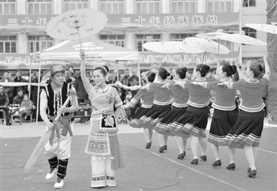 春节期间,罗城仫佬族自治县举行“我们的价值观”·“欢乐仫佬乡”“周周演”第六届农村群众文艺汇演,来自全县11个乡镇60支文艺队共1000多名草根演员送“戏”进城舞动新春,活跃节日气氛。图为2月25日,在该自治县民族文化广场,群众演员在表演节目。(蒙增师 摄)