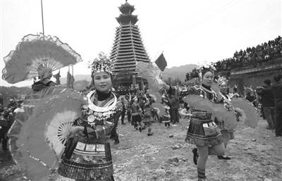3月1日是正月十一,融水苗族自治县滚贝侗族乡举行一年一度的热伴节。当地苗族、侗族同胞穿上节日的盛装,欢聚一堂,参加吹笙踩堂、跳芦笙舞、唱侗族大歌等活动,载歌载舞欢度传统民族节日。“热伴”侗语意为“做伴”,每年这一天,苗族、侗族青年男女纷纷前来寻找心上人,故称为“热伴节”。图为节日活动现场,几名侗家女在跳芦笙舞。(龙林智 摄)