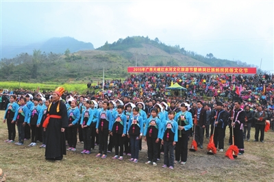 3月2日一大早,来自区内外近万名游客和当地群众一起在纳洞村田坝上现场体验壮族原生态的非物质文化遗产——蚂拐舞民俗表演,同时还欣赏和参与了周边县区民俗文化表演以及传统民族体育竞技活动。据了解,此次文化旅游节举行纳洞村蚂拐节庆、红水河景区游览、红水河流域大歌会、奇石根雕展、书画摄影展等13个民俗节庆活动,充分展现天峨特色文化,打造“红水河、原生态、长寿养生”品牌。