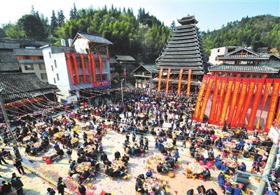 3月12日,三江侗族自治县林溪镇林溪村岩寨屯新建的戏台落成,邻近的湘、黔两省侗族同胞前来祝贺,大家欢聚一堂,以芦笙踩堂、百家宴、侗戏表演等活动激情欢庆。