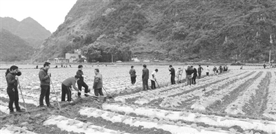 3月12日,自治区民语委结合“干部结对帮扶贫困户活动”,组织干部赴“美丽广西”乡村建设(扶贫)联系点靖西县地州乡古文村开展兴修水利活动。当天,自治区民语委10多名干部在该委副巡视员杨义杰的带领下,加入到古文村热火朝天的兴修水利活动中,与近百名村民群众一起对种植基地中1000多米灌溉水渠进行疏浚,清除杂草、拓宽渠道,提高水渠的灌溉能力。兴修水利活动结束后,杨义杰又带领干部们深入到结对帮扶贫困户中拉家常、谈政策、谋新路,了解结对帮扶对象生活生产情况和困难情况,共同商量脱贫致富新路子。干部们还根据结对帮扶对象的情况各自准备了慰问金和慰问品,给他们送去温暖。图为自治区民语委干部和村民一起开展兴修水利活动现场。