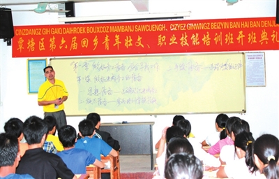 拓宽壮语文教学工作思路,服务现实社会。2007年至2013年,该校先后成功承办了6届由自治区民语委主办,覃塘区就业服务中心协办的回乡青年壮文、技能培训班,为292名即将步入社会的初中毕业生免费培训壮文基础知识、计算机基础知识及其应用技术和有关法律法规知识,掌握一技之长,参加有关资格考试,取得相关的上岗资格证书,提升了自身就业竞争能力和适应职业发展需要的能力。