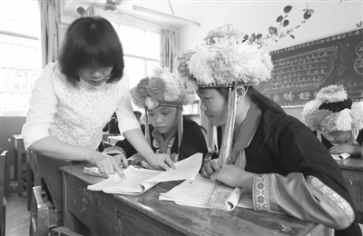 多年来凌云县党委政府高度重视民族教育的发展,加大投入,不断改善学校的办学条件,同时在社会各界的关心支持下,学校教育教学质量逐年得到提高。近年来,国家实施农村义务教育学生营养改善计划,在校学生每天都有伙食补助,学生生活得到保障。学校环境好了,教师责任心强,学生努力学习,办学以来该校为上一级学校输送不少优秀人才。览金小学成为凌云县村级民族教育的窗口学校。图为老师在辅导学生。(肖发凌 摄)